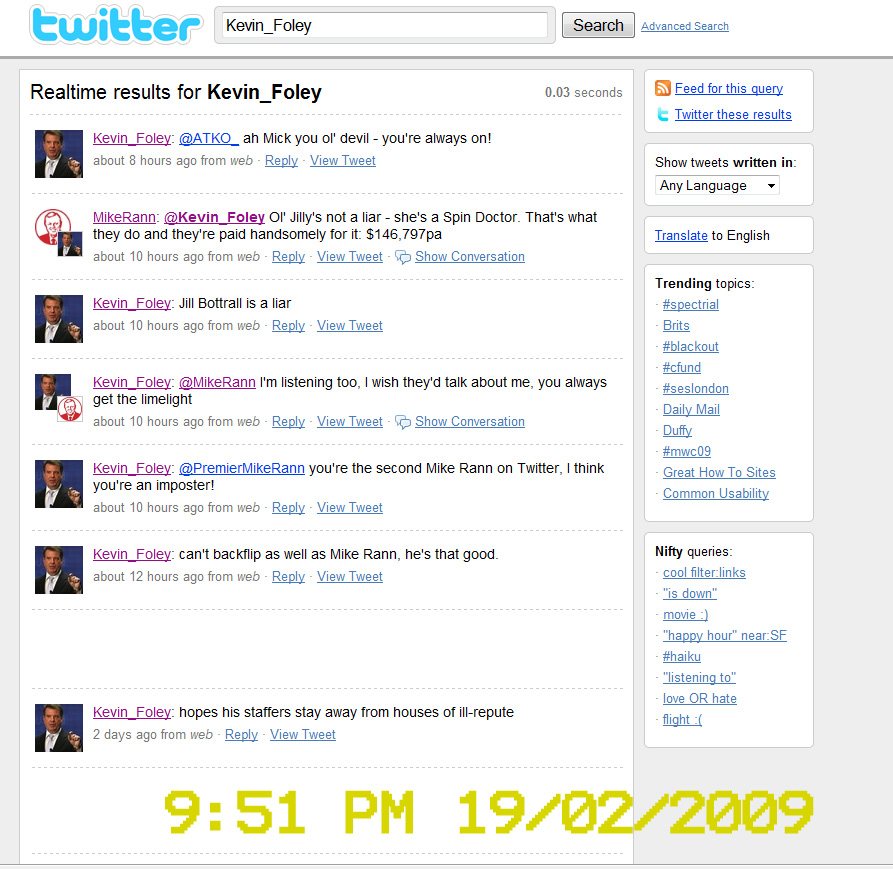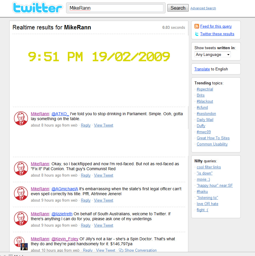 So somebody has been playing funny games on twitter; playing the "MikeRann" character. This character parodied the Premier of South Australia, Mike Rann.